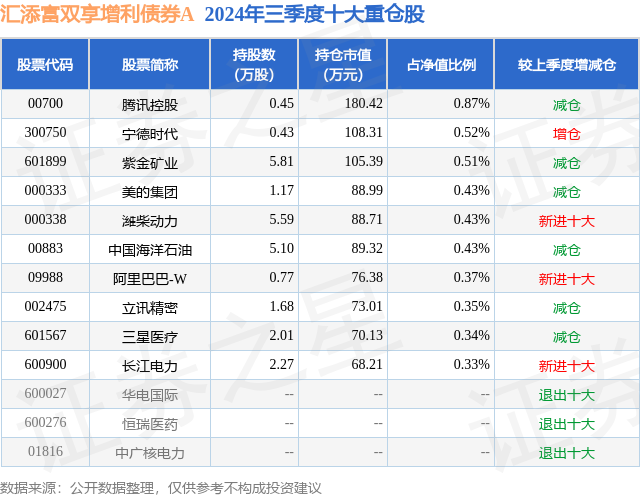 从基金规模来看,汇添富双享增利债券A基金2024年三季度公布的基金规模为1.87亿元,较上一期规模1.84亿元变化了296.66万元,环比变化了1.62%。该基金最新一期资产配置为:股票占净值比10.64%,债券占净值比102.63%,现金占净值比4.04%。从基金持仓来看,该基金当季前十大股票仓位达4.58%,第一大重仓股为腾讯控股(00700),持仓占比为0.87%。