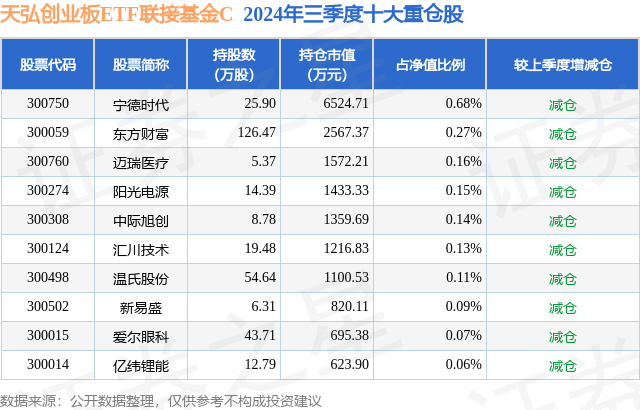 从基金规模来看,天弘创业板ETF联接基金C基金2024年三季度公布的基金规模为81.56亿元,较上一期规模56.93亿元变化了24.63亿元,环比变化了43.27%。该基金最新一期资产配置为:股票占净值比3.46%,债券占净值比0.3%,现金占净值比4.99%。从基金持仓来看,该基金当季前十大股票仓位达1.86%,第一大重仓股为宁德时代(300750),持仓占比为0.68%。