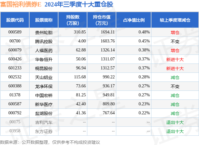 从基金规模来看,富国裕利债券E基金2024年三季度公布的基金规模为15.96亿元,较上一期规模21.09亿元变化了-5.13亿元,环比变化了-24.31%。该基金最新一期资产配置为:股票占净值比9.56%,债券占净值比83.33%,现金占净值比2.83%。从基金持仓来看,该基金当季前十大股票仓位达3.32%,第一大重仓股为贵州轮胎(000589),持仓占比为0.48%。