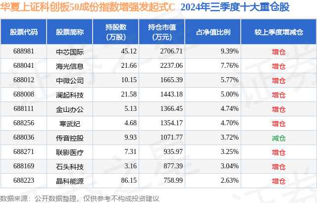 从基金规模来看,华夏上证科创板50成份指数增强发起式C基金2024年三季度公布的基金规模为0.97亿元,较上一期规模7598.89万元变化了2096.21万元,环比变化了27.59%。该基金最新一期资产配置为:股票占净值比94.86%,无债券类资产,现金占净值比5.12%。从基金持仓来看,该基金当季前十大股票仓位达50.0%,第一大重仓股为中芯国际(688981),持仓占比为9.39%。