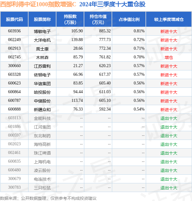 从基金规模来看,西部利得中证1000指数增强C基金2024年三季度公布的基金规模为6.29亿元,较上一期规模5.73亿元变化了5627.23万元,环比变化了9.82%。该基金最新一期资产配置为:股票占净值比91.09%,无债券类资产,现金占净值比5.99%。从基金持仓来看,该基金当季前十大股票仓位达6.3%,第一大重仓股为博敏电子(603936),持仓占比为0.81%。