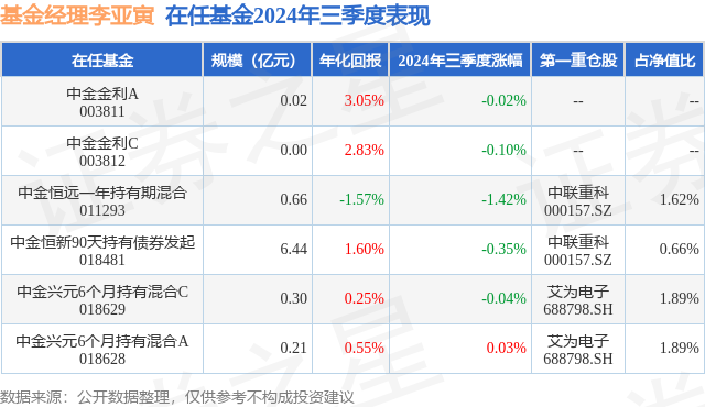 中金恒新90天持有债券发起现任基金经理为李亚寅。其中在任基金经理李亚寅已从业2年又168天,2023年5月15日正式接手管理中金恒新90天持有债券发起,任职期间累计回报为2.33%。目前还管理着6只基金产品(包括A类和C类),其中本季度表现最佳的基金为中金兴元6个月持有混合A(018628),季度净值涨幅为0.03%。