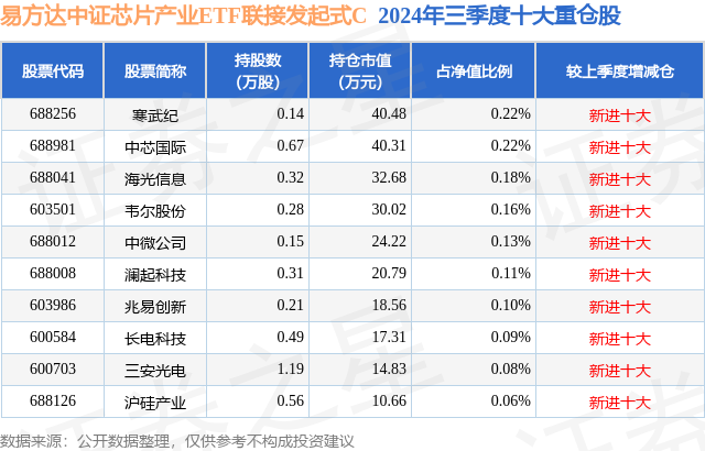 从基金规模来看,易方达中证芯片产业ETF联接发起式C基金2024年三季度公布的基金规模为1.32亿元,较上一期规模7526.98万元变化了5678.38万元,环比变化了75.44%。该基金最新一期资产配置为:股票占净值比1.82%,无债券类资产,现金占净值比5.05%。从基金持仓来看,该基金当季前十大股票仓位达1.35%,第一大重仓股为寒武纪(688256),持仓占比为0.22%。
