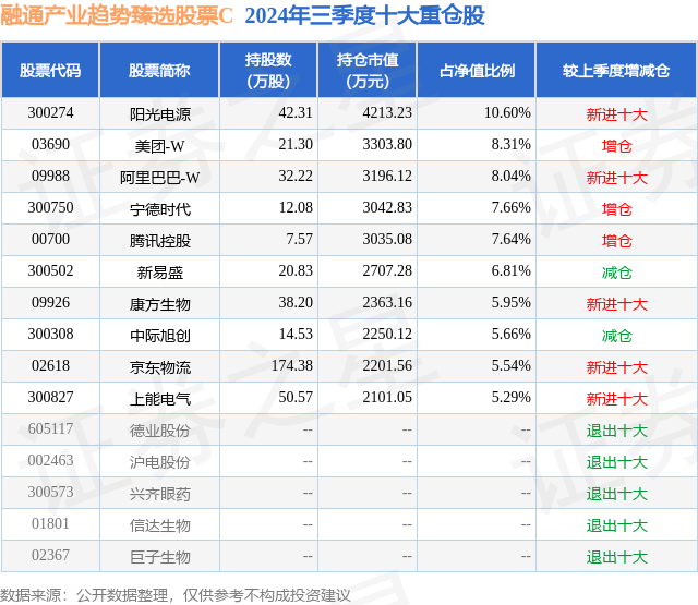 从基金规模来看,融通产业趋势臻选股票C基金2024年三季度公布的基金规模为1.06亿元,较上一期规模1060.53万元变化了9497.98万元,环比变化了895.59%。该基金最新一期资产配置为:股票占净值比91.03%,无债券类资产,现金占净值比6.2%。从基金持仓来看,该基金当季前十大股票仓位达71.5%,第一大重仓股为阳光电源(300274),持仓占比为10.6%。