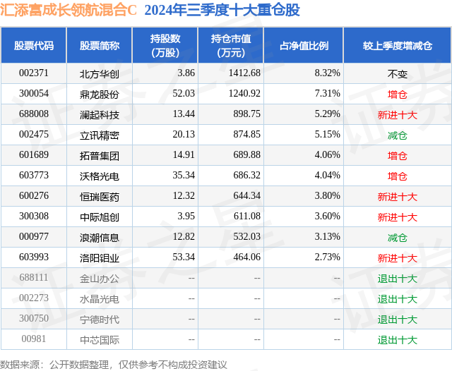 从基金规模来看,汇添富成长领航混合C基金2024年三季度公布的基金规模为1.21亿元,较上一期规模1.14亿元变化了704.9万元,环比变化了6.18%。该基金最新一期资产配置为:股票占净值比92.18%,无债券类资产,现金占净值比8.05%。从基金持仓来看,该基金当季前十大股票仓位达47.43%,第一大重仓股为北方华创(002371),持仓占比为8.32%。