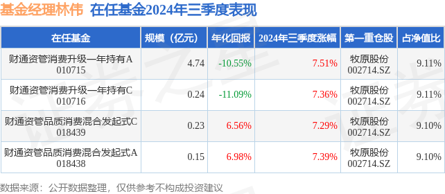 从基金规模来看,财通资管品质消费混合发起式C基金2024年三季度公布的基金规模为0.23亿元,较上一期规模2229.71万元变化了110.17万元,环比变化了4.94%。该基金最新一期资产配置为:股票占净值比89.78%,无债券类资产,现金占净值比11.51%。从基金持仓来看,该基金当季前十大股票仓位达69.14%,第一大重仓股为牧原股份(002714),持仓占比为9.1%。