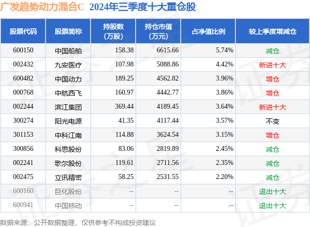 从基金规模来看,广发趋势动力混合C基金2024年三季度公布的基金规模为2.77亿元,较上一期规模2.44亿元变化了3348.07万元,环比变化了13.72%。该基金最新一期资产配置为:股票占净值比75.94%,债券占净值比1.29%,现金占净值比5.09%。从基金持仓来看,该基金当季前十大股票仓位达35.34%,第一大重仓股为中国船舶(600150),持仓占比为5.74%。
