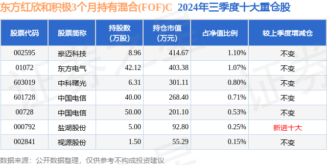 从基金规模来看,东方红欣和积极3个月持有混合(FOF)C基金2024年三季度公布的基金规模为2.56亿元,较上一期规模2.47亿元变化了891.0万元,环比变化了3.61%。该基金最新一期资产配置为:股票占净值比4.61%,债券占净值比3.75%,现金占净值比1.75%。从基金持仓来看,该基金当季前十大股票仓位达4.61%,第一大重仓股为豪迈科技(002595),持仓占比为1.1%。