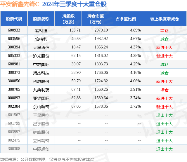 从基金规模来看,平安新鑫先锋C基金2024年三季度公布的基金规模为1.95亿元,较上一期规模1.81亿元变化了1354.97万元,环比变化了7.48%。该基金最新一期资产配置为:股票占净值比89.33%,无债券类资产,现金占净值比13.81%。从基金持仓来看,该基金当季前十大股票仓位达42.05%,第一大重仓股为爱柯迪(600933),持仓占比为4.89%。