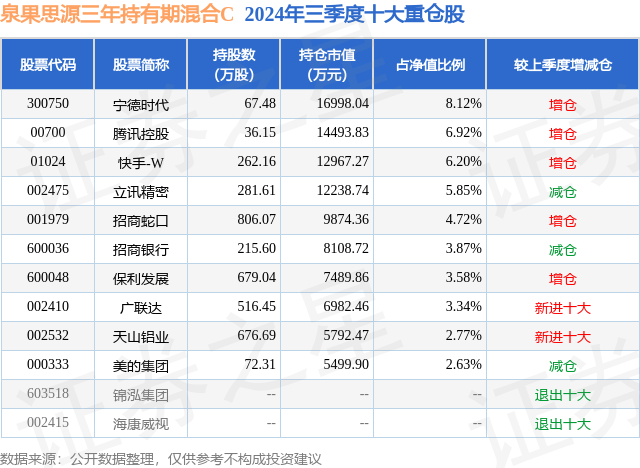 从基金规模来看,泉果思源三年持有期混合C基金2024年三季度公布的基金规模为0.36亿元,较上一期规模3119.07万元变化了479.35万元,环比变化了15.37%。该基金最新一期资产配置为:股票占净值比86.19%,无债券类资产,现金占净值比8.89%。从基金持仓来看,该基金当季前十大股票仓位达48.0%,第一大重仓股为宁德时代(300750),持仓占比为8.12%。