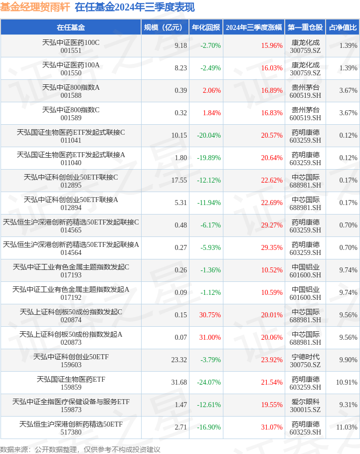 证券之星消息,日前天弘中证医药100A基金公布三季报,2024年三季度最新规模8.23亿元,季度净值涨幅为16.03%。