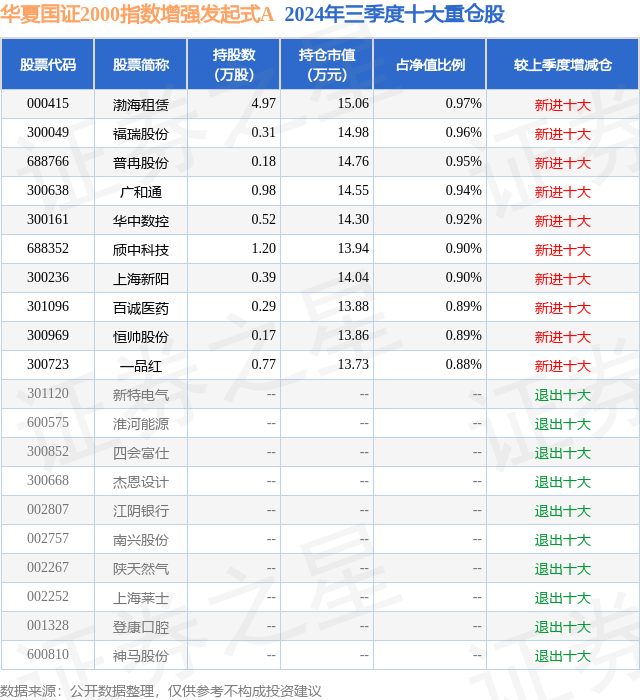 证券之星消息,日前华夏国证2000指数增强发起式A基金公布三季报,2024年三季度最新规模0.11亿元,季度净值涨幅为17.79%。