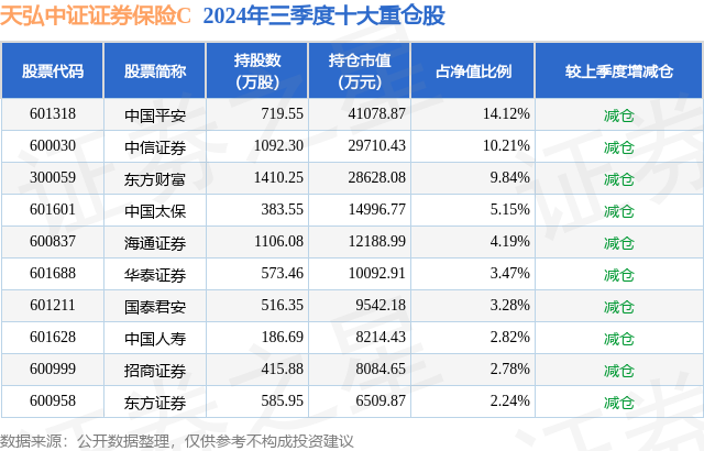 从基金规模来看,天弘中证证券保险C基金2024年三季度公布的基金规模为16.8亿元,较上一期规模12.38亿元变化了4.42亿元,环比变化了35.69%。该基金最新一期资产配置为:股票占净值比96.33%,债券占净值比0.24%,现金占净值比5.08%。从基金持仓来看,该基金当季前十大股票仓位达58.1%,第一大重仓股为中国平安(601318),持仓占比为14.12%。