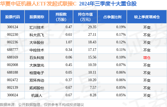 从基金规模来看,华夏中证机器人ETF发起式联接C基金2024年三季度公布的基金规模为1.15亿元,较上一期规模9424.1万元变化了2088.87万元,环比变化了22.17%。该基金最新一期资产配置为:股票占净值比1.75%,无债券类资产,现金占净值比5.33%。从基金持仓来看,该基金当季前十大股票仓位达0.98%,第一大重仓股为汇川技术(300124),持仓占比为0.19%。