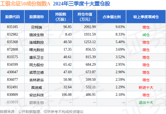 从基金规模来看,工银北证50成份指数A基金2024年三季度公布的基金规模为0.62亿元,较上一期规模4621.55万元变化了1569.59万元,环比变化了33.96%。该基金最新一期资产配置为:股票占净值比86.12%,债券占净值比0.17%,现金占净值比5.38%。从基金持仓来看,该基金当季前十大股票仓位达42.8%,第一大重仓股为贝特瑞(835185),持仓占比为9.03%。