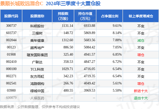 从基金规模来看,景顺长城致远混合C基金2024年三季度公布的基金规模为0.31亿元,较上一期规模2576.35万元变化了517.41万元,环比变化了20.08%。该基金最新一期资产配置为:股票占净值比93.32%,无债券类资产,现金占净值比6.64%。从基金持仓来看,该基金当季前十大股票仓位达70.44%,第一大重仓股为科顺股份(300737),持仓占比为9.61%。