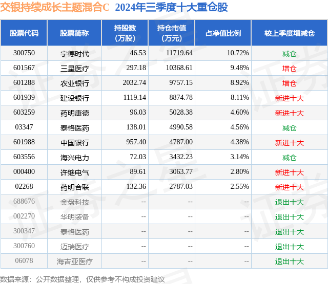 从基金规模来看,交银持续成长主题混合C基金2024年三季度公布的基金规模为0.08亿元,较上一期规模142.0万元变化了646.35万元,环比变化了455.16%。该基金最新一期资产配置为:股票占净值比74.19%,债券占净值比4.6%,现金占净值比20.01%。从基金持仓来看,该基金当季前十大股票仓位达59.26%,第一大重仓股为宁德时代(300750),持仓占比为10.72%。
