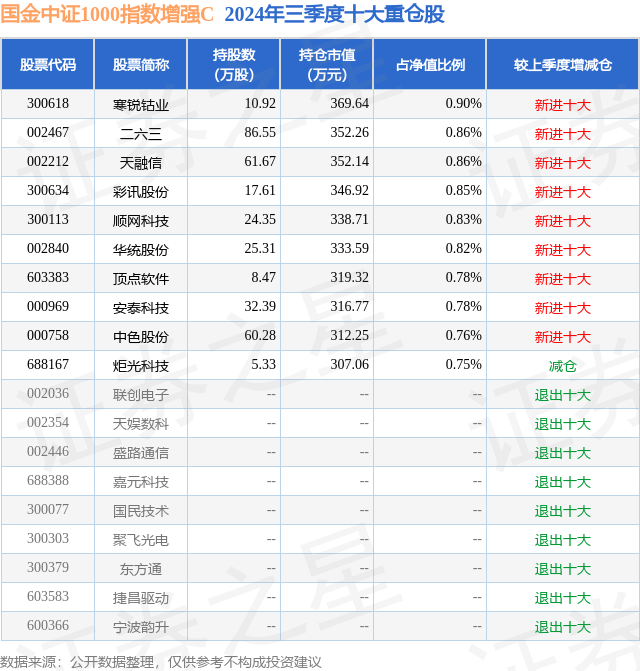从基金规模来看,国金中证1000指数增强C基金2024年三季度公布的基金规模为1.49亿元,较上一期规模1.41亿元变化了873.32万元,环比变化了6.21%。该基金最新一期资产配置为:股票占净值比91.47%,无债券类资产,现金占净值比8.43%。从基金持仓来看,该基金当季前十大股票仓位达8.19%,第一大重仓股为寒锐钴业(300618),持仓占比为0.9%。