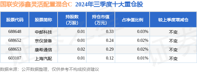 从基金规模来看,国联安添鑫灵活配置混合C基金2024年三季度公布的基金规模为0.03亿元,较上一期规模354.53万元变化了-6.5万元,环比变化了-1.83%。该基金最新一期资产配置为:股票占净值比0.08%,债券占净值比91.32%,现金占净值比9.27%。从基金持仓来看,该基金当季前十大股票仓位达0.08%,第一大重仓股为中邮科技(688648),持仓占比为0.03%。