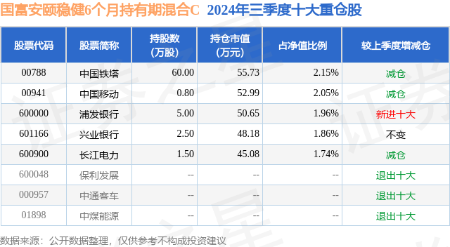 从基金规模来看,国富安颐稳健6个月持有期混合C基金2024年三季度公布的基金规模为0.24亿元,较上一期规模3026.32万元变化了-654.9万元,环比变化了-21.64%。该基金最新一期资产配置为:股票占净值比9.75%,债券占净值比98.79%,现金占净值比0.51%。从基金持仓来看,该基金当季前十大股票仓位达9.76%,第一大重仓股为中国铁塔(00788),持仓占比为2.15%。