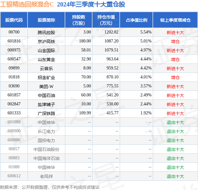 从基金规模来看,工银精选回报混合C基金2024年三季度公布的基金规模为0.99亿元,较上一期规模9874.8万元变化了28.42万元,环比变化了0.29%。该基金最新一期资产配置为:股票占净值比61.66%,债券占净值比20.89%,现金占净值比11.84%。从基金持仓来看,该基金当季前十大股票仓位达38.81%,第一大重仓股为腾讯控股(00700),持仓占比为5.54%。