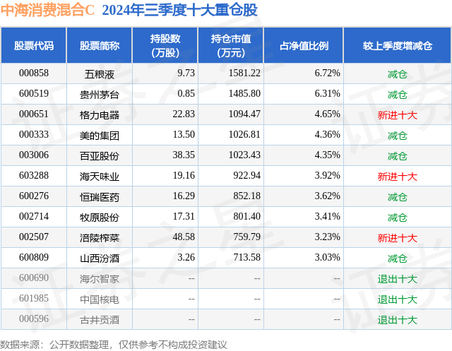 从基金规模来看,中海消费混合C基金2024年三季度公布的基金规模为0.0亿元,较上一期规模24.17万元变化了6.96万元,环比变化了28.81%。该基金最新一期资产配置为:股票占净值比87.17%,无债券类资产,现金占净值比12.35%。从基金持仓来看,该基金当季前十大股票仓位达43.6%,第一大重仓股为五粮液(000858),持仓占比为6.72%。