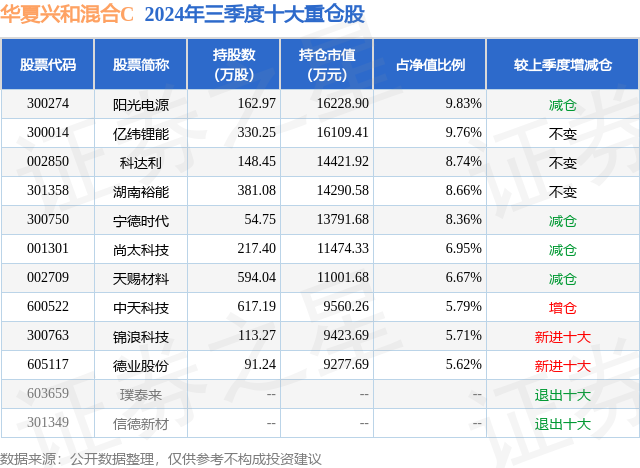 从基金规模来看,华夏兴和混合C基金2024年三季度公布的基金规模为0.86亿元,较上一期规模7992.0万元变化了608.99万元,环比变化了7.62%。该基金最新一期资产配置为:股票占净值比91.91%,债券占净值比4.29%,现金占净值比7.49%。从基金持仓来看,该基金当季前十大股票仓位达76.09%,第一大重仓股为阳光电源(300274),持仓占比为9.83%。