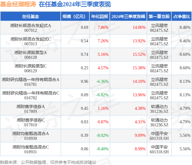 湘财鑫享债券C现任基金经理为徐亦达 刘勇驿 程涛。其中在任基金经理程涛已从业9年又70天,2023年3月23日正式接手管理湘财鑫享债券C,任职期间累计回报为1.39%。目前还管理着10只基金产品(包括A类和C类),其中本季度表现最佳的基金为湘财长源股票型A(008128),季度净值涨幅为15.52%。
