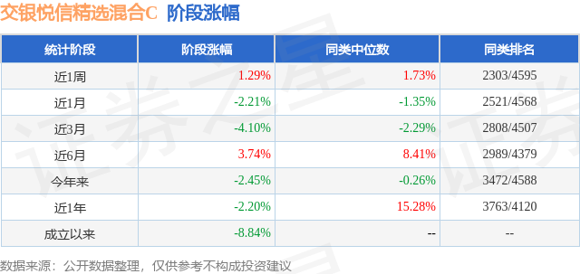 从业绩表现来看,交银悦信精选混合C基金过去一年净值涨幅为-4.2%,在同类基金中排名3313/3979,同类基金过去一年净值涨幅中位数为5.4%。而基金过去一年的最大回撤为-17.8%,成立以来的最大回撤为-17.8%。