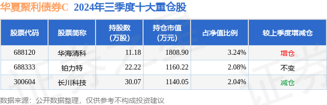 从基金规模来看,华夏聚利债券C基金2024年三季度公布的基金规模为0.01亿元,较上一期规模63.05万元变化了27.17万元,环比变化了43.09%。该基金最新一期资产配置为:股票占净值比7.37%,债券占净值比93.29%,现金占净值比3.99%。从基金持仓来看,该基金当季前十大股票仓位达7.36%,第一大重仓股为华海清科(688120),持仓占比为3.24%。