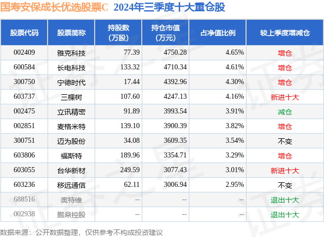 从基金规模来看,国寿安保成长优选股票C基金2024年三季度公布的基金规模为0.0亿元,较上一期规模10.01万元变化了8.03万元,环比变化了80.24%。该基金最新一期资产配置为:股票占净值比92.77%,无债券类资产,现金占净值比6.8%。从基金持仓来看,该基金当季前十大股票仓位达38.24%,第一大重仓股为雅克科技(002409),持仓占比为4.65%。