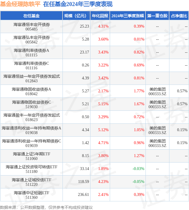 证券之星消息,日前海富通稳固收益债券A基金公布三季报,2024年三季度最新规模5.27亿元,季度净值涨幅为1.77%。