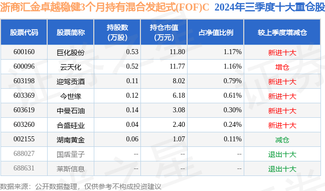 从基金规模来看,浙商汇金卓越稳健3个月持有混合发起式(FOF)C基金2024年三季度公布的基金规模为0.0亿元,较上一期规模8.23万元变化了-7.91万元,环比变化了-96.12%。该基金最新一期资产配置为:股票占净值比4.38%,债券占净值比1.01%,现金占净值比6.07%。从基金持仓来看,该基金当季前十大股票仓位达4.38%,第一大重仓股为巨化股份(600160),持仓占比为1.17%。