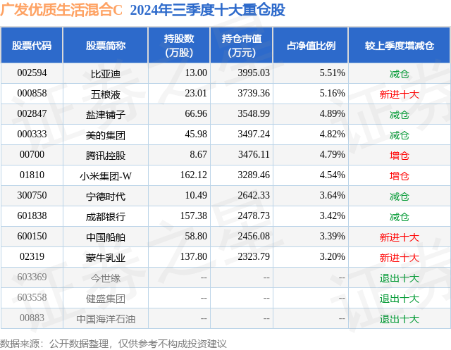 从基金规模来看,广发优质生活混合C基金2024年三季度公布的基金规模为0.01亿元,较上一期规模24.09万元变化了31.54万元,环比变化了130.88%。该基金最新一期资产配置为:股票占净值比82.17%,债券占净值比0.76%,现金占净值比10.62%。从基金持仓来看,该基金当季前十大股票仓位达43.36%,第一大重仓股为比亚迪(002594),持仓占比为5.51%。