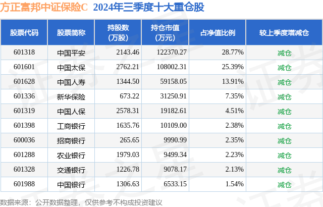 从基金规模来看,方正富邦中证保险C基金2024年三季度公布的基金规模为9.4亿元,较上一期规模8.63亿元变化了7723.39万元,环比变化了8.95%。该基金最新一期资产配置为:股票占净值比94.93%,无债券类资产,现金占净值比6.55%。从基金持仓来看,该基金当季前十大股票仓位达90.56%,第一大重仓股为中国平安(601318),持仓占比为28.77%。