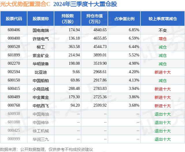 从基金规模来看,光大优势配置混合C基金2024年三季度公布的基金规模为0.0亿元,较上一期规模10.21万元变化了-0.31万元,环比变化了-3.02%。该基金最新一期资产配置为:股票占净值比86.83%,债券占净值比4.93%,现金占净值比8.73%。从基金持仓来看,该基金当季前十大股票仓位达50.19%,第一大重仓股为国电南瑞(600406),持仓占比为6.85%。