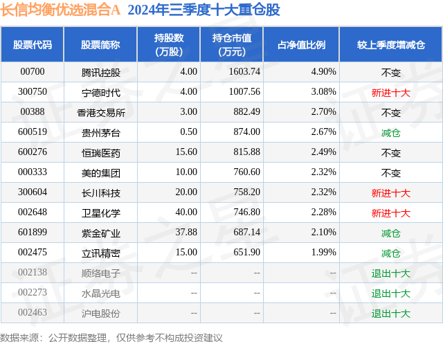 从基金规模来看,长信均衡优选混合A基金2024年三季度公布的基金规模为2.05亿元,较上一期规模1.81亿元变化了2409.95万元,环比变化了13.33%。该基金最新一期资产配置为:股票占净值比92.19%,无债券类资产,现金占净值比9.87%。从基金持仓来看,该基金当季前十大股票仓位达26.85%,第一大重仓股为腾讯控股(00700),持仓占比为4.9%。