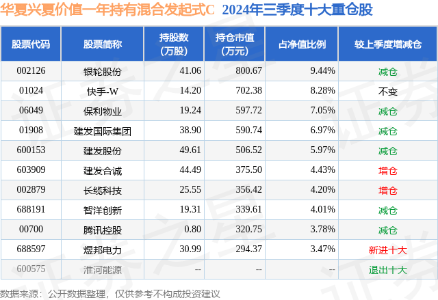 从基金规模来看,华夏兴夏价值一年持有混合发起式C基金2024年三季度公布的基金规模为0.41亿元,较上一期规模3910.06万元变化了214.17万元,环比变化了5.48%。该基金最新一期资产配置为:股票占净值比90.34%,债券占净值比0.29%,现金占净值比7.54%。从基金持仓来看,该基金当季前十大股票仓位达57.6%,第一大重仓股为银轮股份(002126),持仓占比为9.44%。