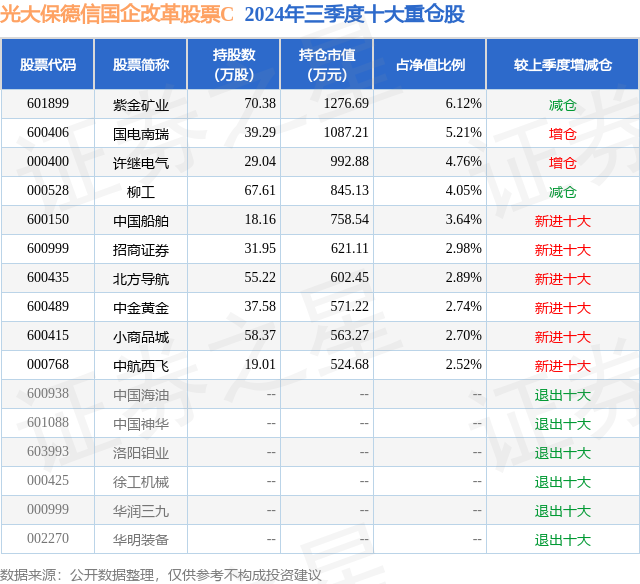从基金规模来看,光大保德信国企改革股票C基金2024年三季度公布的基金规模为0.0亿元,较上一期规模11.33万元变化了-4.62万元,环比变化了-40.8%。该基金最新一期资产配置为:股票占净值比84.86%,无债券类资产,现金占净值比16.39%。从基金持仓来看,该基金当季前十大股票仓位达37.61%,第一大重仓股为紫金矿业(601899),持仓占比为6.12%。