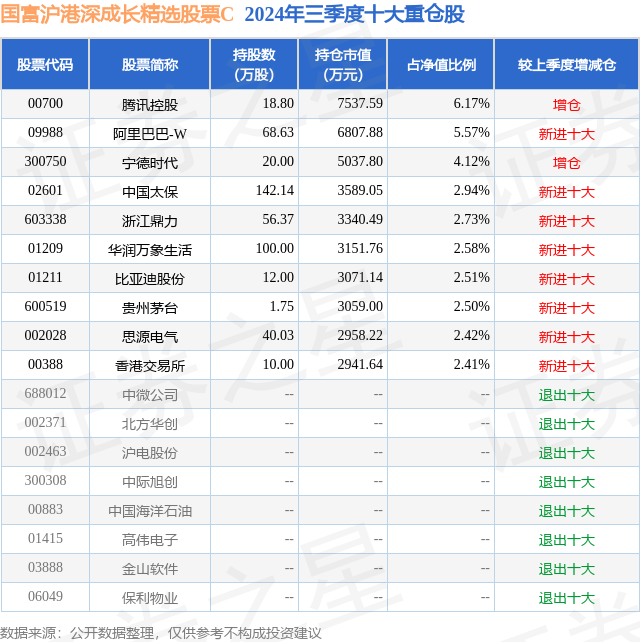 从基金规模来看,国富沪港深成长精选股票C基金2024年三季度公布的基金规模为0.4亿元,较上一期规模1521.63万元变化了2518.05万元,环比变化了165.48%。该基金最新一期资产配置为:股票占净值比80.21%,债券占净值比5.1%,现金占净值比6.03%。从基金持仓来看,该基金当季前十大股票仓位达33.95%,第一大重仓股为腾讯控股(00700),持仓占比为6.17%。