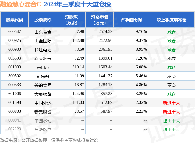 从基金规模来看,融通慧心混合C基金2024年三季度公布的基金规模为0.58亿元,较上一期规模7065.07万元变化了-1304.34万元,环比变化了-18.46%。该基金最新一期资产配置为:股票占净值比81.53%,无债券类资产,现金占净值比12.43%。从基金持仓来看,该基金当季前十大股票仓位达59.48%,第一大重仓股为山东黄金(600547),持仓占比为9.76%。