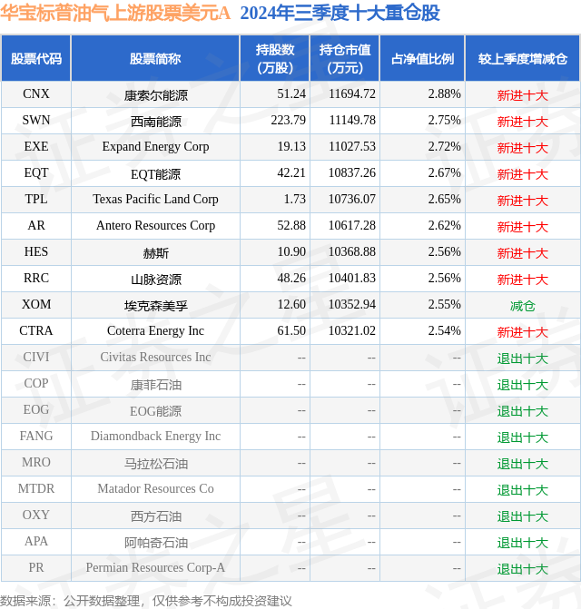从基金规模来看,华宝标普油气上游股票美元A基金2024年三季度公布的基金规模为21.62亿元,较上一期规模26.69亿元变化了-5.07亿元,环比变化了-19.0%。该基金最新一期资产配置为:股票占净值比95.25%,无债券类资产,现金占净值比8.1%。从基金持仓来看,该基金当季前十大股票仓位达26.5%,第一大重仓股为康索尔能源(CNX),持仓占比为2.88%。