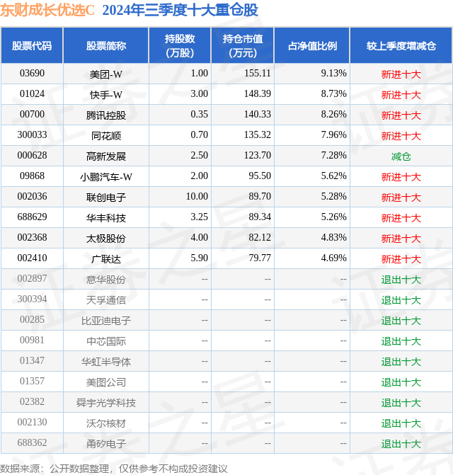 从基金规模来看,东财成长优选C基金2024年三季度公布的基金规模为0.07亿元,较上一期规模728.67万元变化了-63.64万元,环比变化了-8.73%。该基金最新一期资产配置为:股票占净值比94.22%,无债券类资产,现金占净值比6.84%。从基金持仓来看,该基金当季前十大股票仓位达67.04%,第一大重仓股为美团-W(03690),持仓占比为9.13%。
