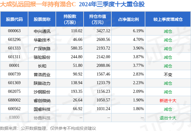 从基金规模来看,大成弘远回报一年持有混合C基金2024年三季度公布的基金规模为1.36亿元,较上一期规模1.33亿元变化了211.03万元,环比变化了1.58%。该基金最新一期资产配置为:股票占净值比62.04%,无债券类资产,现金占净值比24.41%。从基金持仓来看,该基金当季前十大股票仓位达33.4%,第一大重仓股为中兴通讯(000063),持仓占比为6.19%。