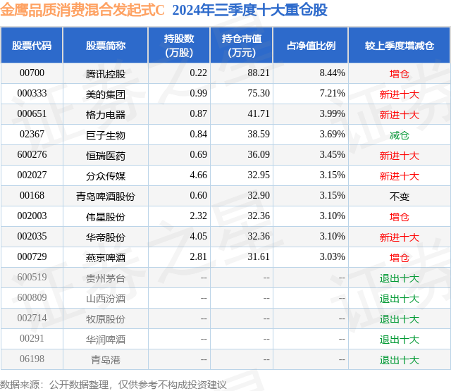 从基金规模来看,金鹰品质消费混合发起式C基金2024年三季度公布的基金规模为0.03亿元,较上一期规模255.09万元变化了17.76万元,环比变化了6.96%。该基金最新一期资产配置为:股票占净值比91.36%,无债券类资产,现金占净值比1.28%。从基金持仓来看,该基金当季前十大股票仓位达42.31%,第一大重仓股为腾讯控股(00700),持仓占比为8.44%。