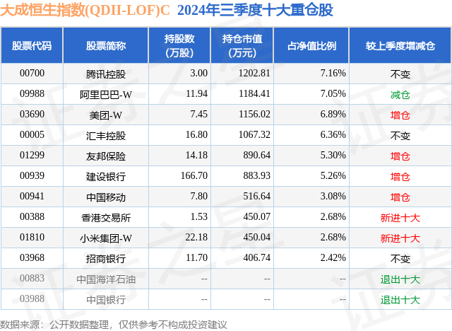 从基金规模来看,大成恒生指数(QDII-LOF)C基金2024年三季度公布的基金规模为0.26亿元,较上一期规模1523.26万元变化了1055.24万元,环比变化了69.28%。该基金最新一期资产配置为:股票占净值比87.61%,无债券类资产,现金占净值比13.61%。从基金持仓来看,该基金当季前十大股票仓位达48.88%,第一大重仓股为腾讯控股(00700),持仓占比为7.16%。