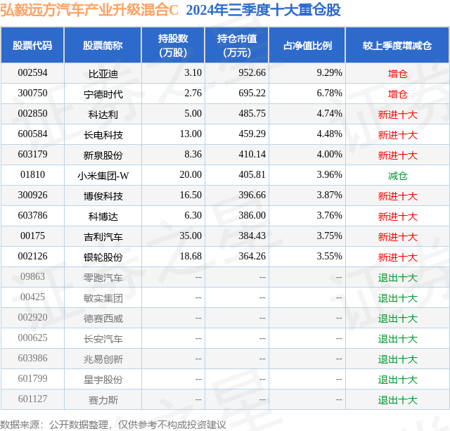 证券之星消息,日前弘毅远方汽车产业升级混合C基金公布三季报,2024年三季度最新规模0.73亿元,季度净值涨幅为10.16%。