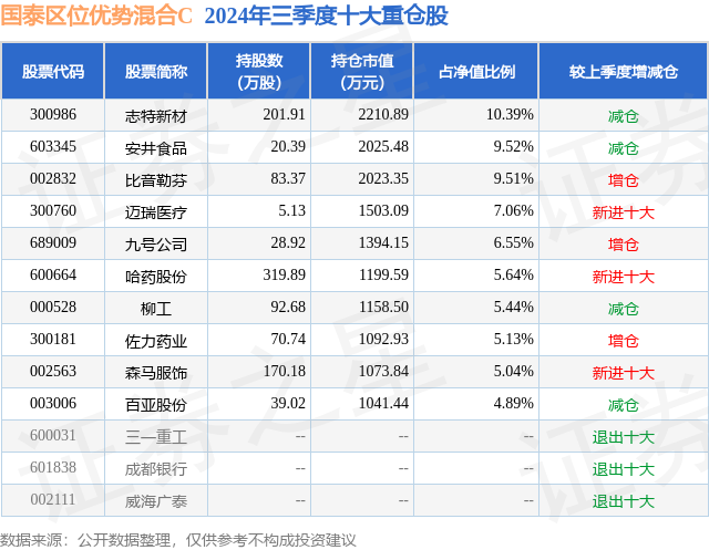 从基金规模来看,国泰区位优势混合C基金2024年三季度公布的基金规模为0.22亿元,较上一期规模1469.39万元变化了684.85万元,环比变化了46.61%。该基金最新一期资产配置为:股票占净值比94.4%,债券占净值比4.43%,现金占净值比0.97%。从基金持仓来看,该基金当季前十大股票仓位达69.17%,第一大重仓股为志特新材(300986),持仓占比为10.39%。