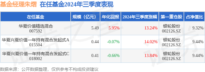 从基金规模来看,华夏兴夏价值一年持有混合发起式A基金2024年三季度公布的基金规模为0.44亿元,较上一期规模4012.02万元变化了342.25万元,环比变化了8.53%。该基金最新一期资产配置为:股票占净值比90.34%,债券占净值比0.29%,现金占净值比7.54%。从基金持仓来看,该基金当季前十大股票仓位达57.6%,第一大重仓股为银轮股份(002126),持仓占比为9.44%。