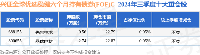 从基金规模来看,兴证全球优选稳健六个月持有债券(FOF)C基金2024年三季度公布的基金规模为1.9亿元,较上一期规模2.11亿元变化了-2061.62万元,环比变化了-9.79%。该基金最新一期资产配置为:股票占净值比0.1%,债券占净值比5.03%,现金占净值比1.56%。从基金持仓来看,该基金当季前十大股票仓位达0.1%,第一大重仓股为先惠技术(688155),持仓占比为0.05%。